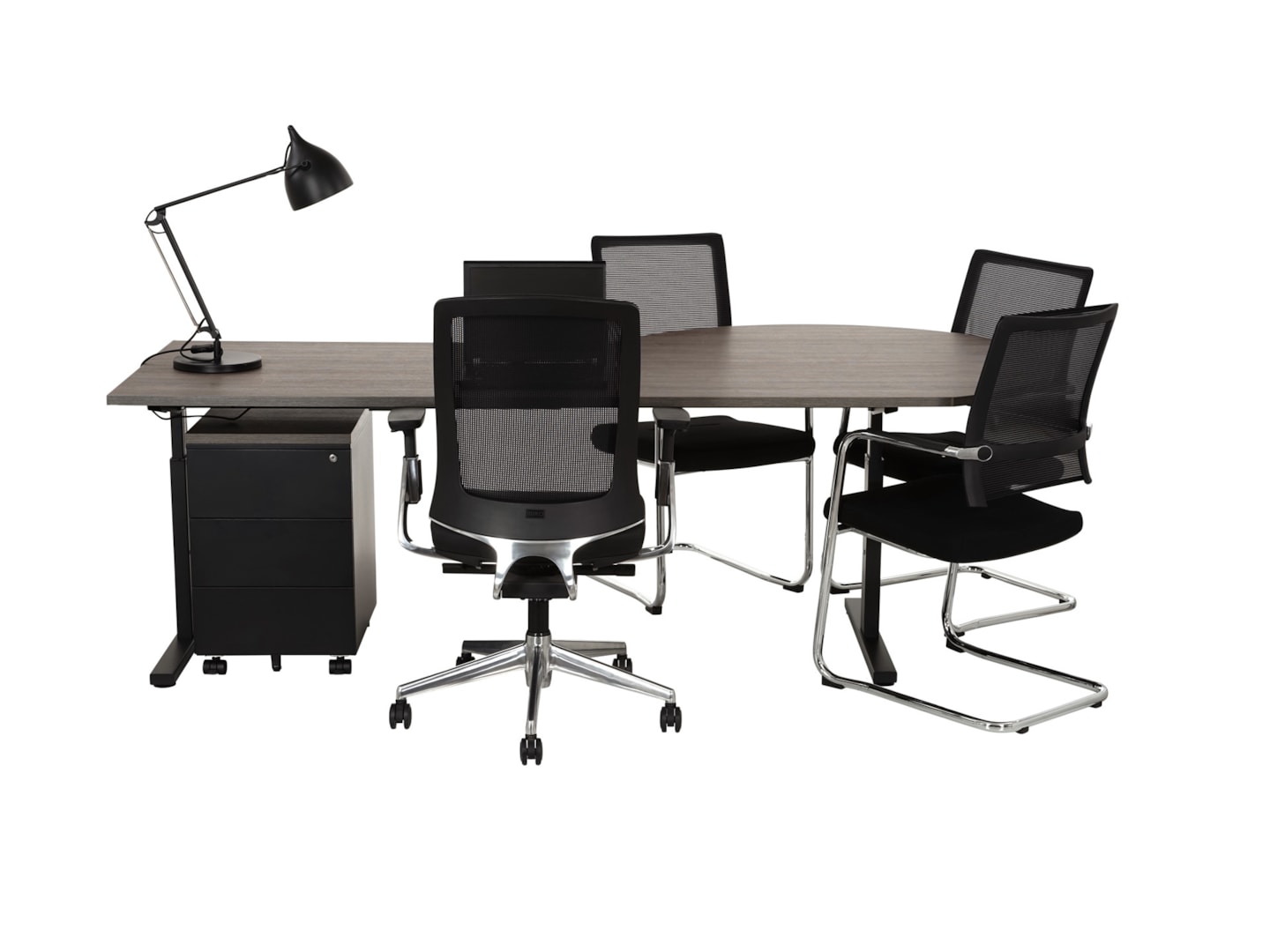Een groot managers bureau met vergaderdruppel om klanten of collega’s te ontvangen. Door de vergadertafel heeft uw bezoek altijd een aangename plek voor kleine vergaderingen. Het bureau is hoogte instelbaar met inbussleutel en het vergaderstuk heeft plek voor 3.