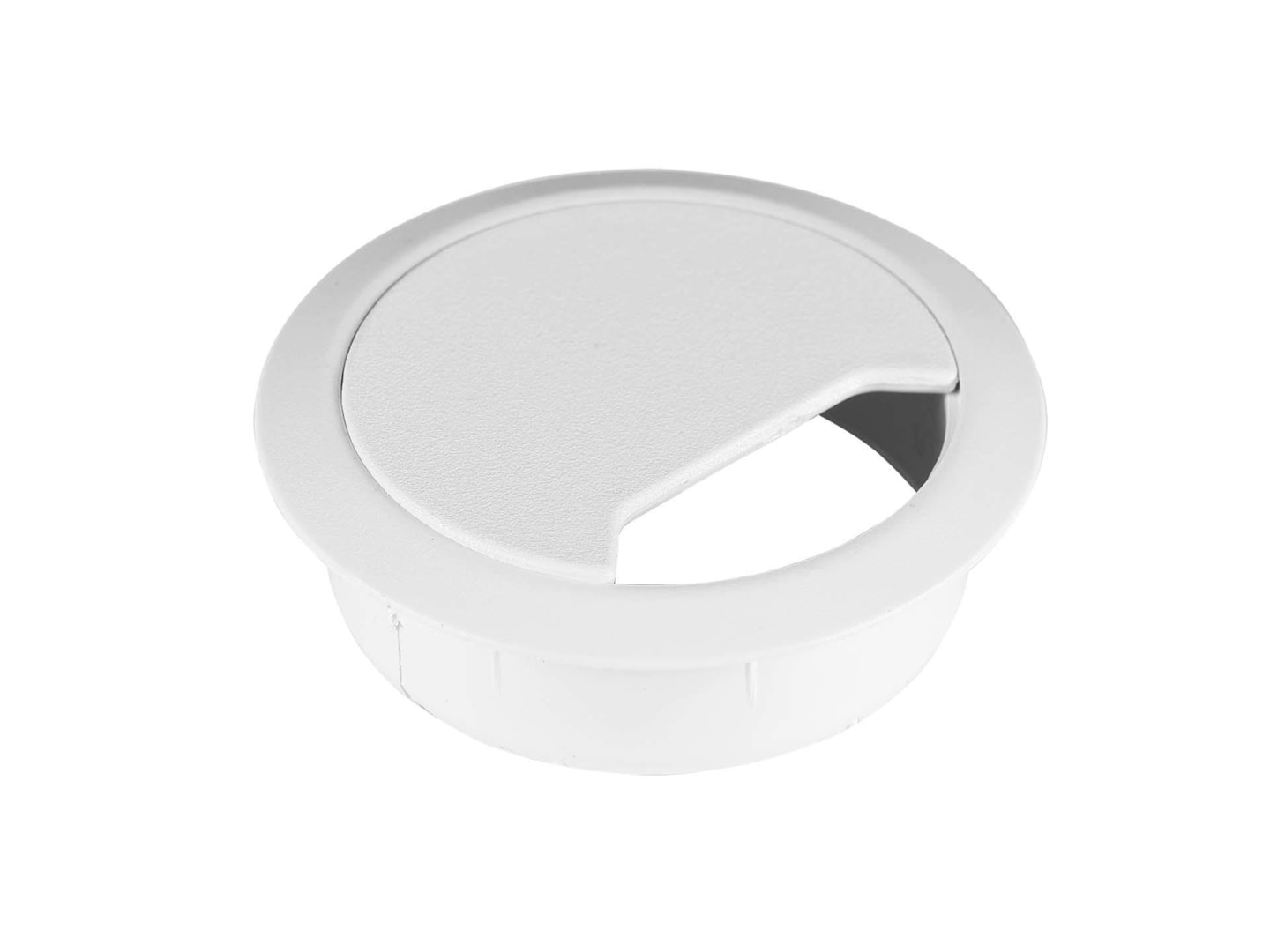 Een kabeldoorvoergat met kunststof afwerkdop om kabels netjes door het tafelblad te leiden. De afwerkdop heeft een klepje, zodat de uiteinden van de stekkers er doorheen passen en kabels netjes weggewerkt zijn. De 60mm diameter is precies voldoende om alle eurostekkers hier doorheen te laten lopen. Geboord doorvoergat is optioneel bij uw blad te bestellen.